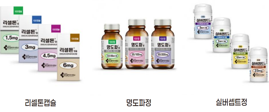 - CNS 약물분야에서 확고한 시장지위 확보. 파킨슨병 치료제 '명도파', 치매치료제 '리셀톤', '실버셉트' 등 다양한 CNS 관련 제품 보유. 최근 파킨슨병 치료제 '에베나마이드', 파킨슨 치료제 'P2B001' 등 신약 파이프라인 도입.