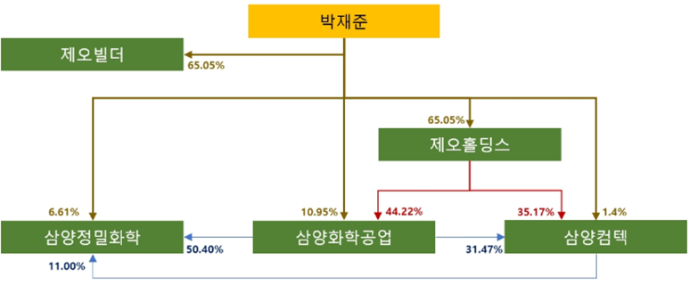 최대주주 제오홀딩스는 삼양컴텍외에 삼양화학공업을 두고 있음. 제오홀딩스 지배주주는 박재준 대표로 제오빌더와 제오홀딩스를 통해 삼양정밀화학까지 총괄.