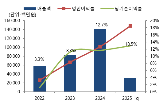 - 2022년~2024년 매출은 연평균 58%, 영업이익은 449%증가. 2024년 매출액과 영업이익은 각각 1416억원,181억원 등 가파른 성장 기록.
