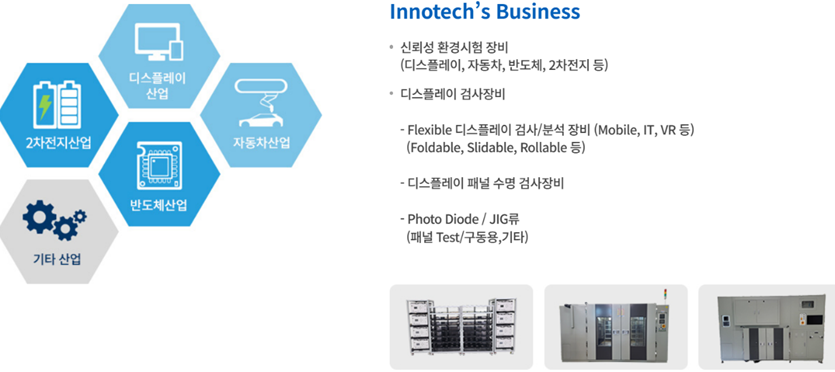 2. 반도체: 반도체 부품 및 제품의 복합 환경신뢰성시험장비. 고객사 니즈에 맞추어 반도체용 소재 및 부품 신뢰성 검사장비 개발, 제조, 제품을 공급. MLCC, SSD 등에 대한 반도체 장비를 납품.