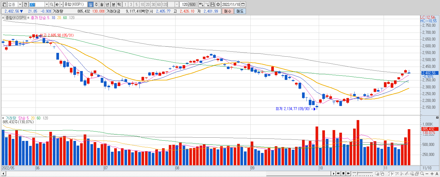 시장의 관심은 전일 언급한 바와 같이 옵션만기 변동성 흐름과 미국 소비자물가지수(CPI) 경계감 그리고 미국 중간선거 이벤트 종료에 따른 차익성 매물이 나온 상황. 다만 최근 시장을 주도하고 있는 외국인의 매매동향에는 아직까지 큰 변화는 없는 것으로 판단됨. 코스피 2400pt 대에서 단기 상승 종목별 매물 소화과정으로 해석. 아직까지 외국인 수급외에 뚜렷한 매수주체, 모멘텀이 부재한 상황속에 기관수급과 거래대금은 추세를 돌리기에 시간이 필요한 모습. 중소형주 매수 공백 지속으로 체감 지수하락은 더 큰 상황. 일부 원전관련주, 미용, 수소 관련주 상승, 네옴시티관련주 조정흐름 보이는 등 중소형 개별주 종목별 차별화 장세 지속.