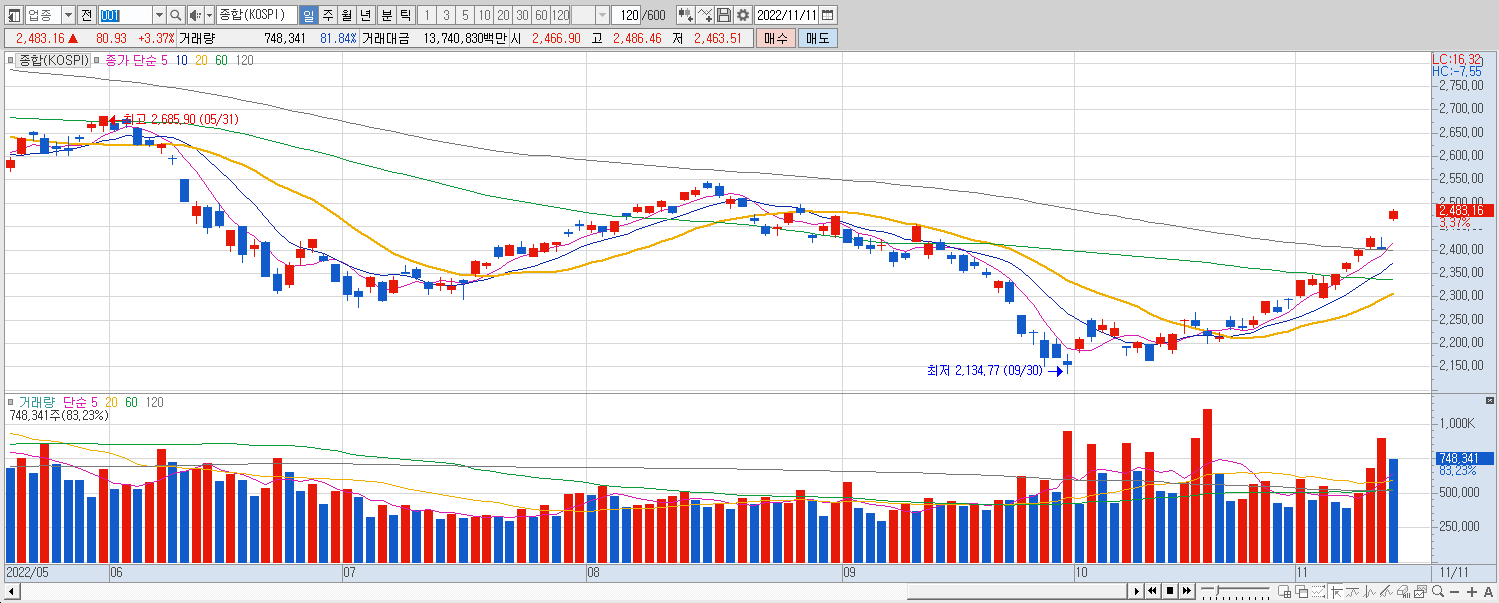 미국 CPI 예상치 하회에 따른 뉴욕증시 급등(나스닥 7%) 영향과 환율 하락에 코스피 급등.
