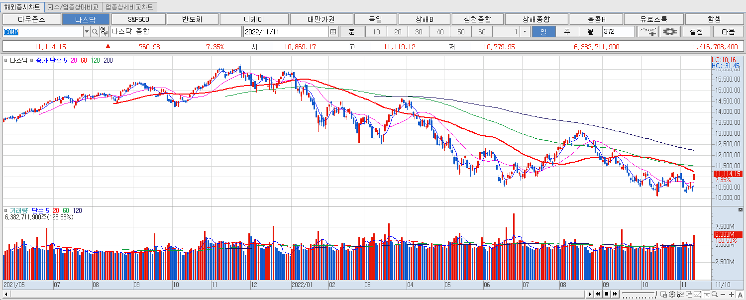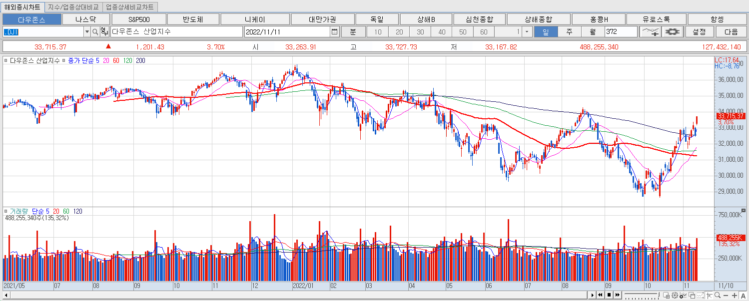 지수(CPI)둔화 소식에 12월 FOMC회의 '빅스텝(50bp금리인상)' 기대감 부각으로 폭등. 다우 3만 3715.37(+3.7%), 나스닥 1만 1114.15(+ 7.35%)
