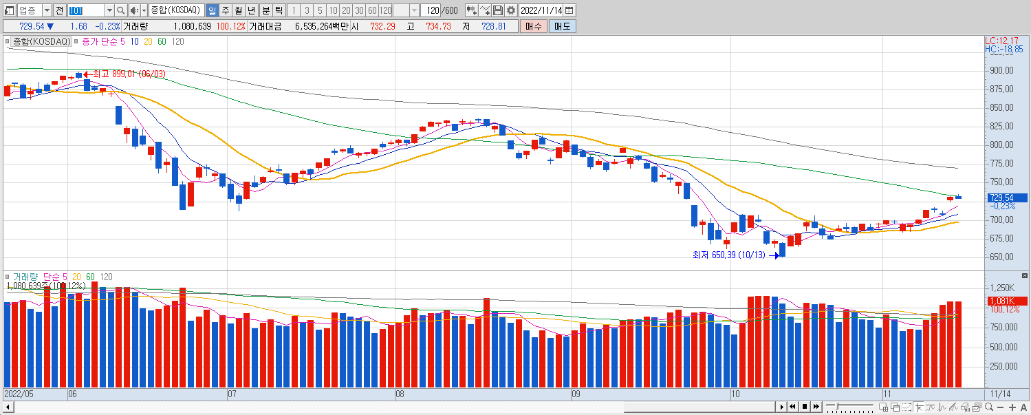 CPI관련 미국 인플레이션 정점 기대감은 여전히 시장 버티는 요인으로 작용하고 있지만 FTX 가상화폐시장 관련 불확실성에 투자자들 이목이 집중되는 상황 속에 위험자산에 대한 회피 심리도 일부 작용.