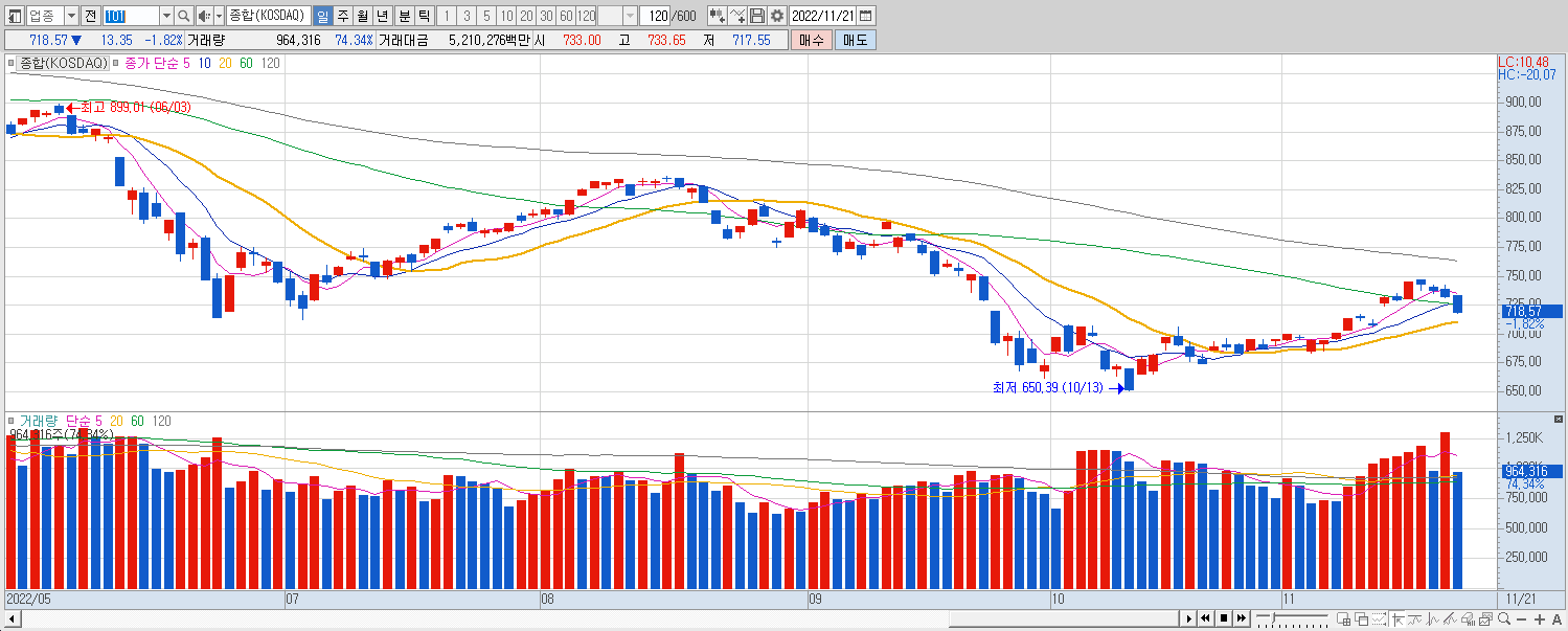 11.21 마감 시황, 중국 코로나 우려 부각과 외국인 매도로 하락마감