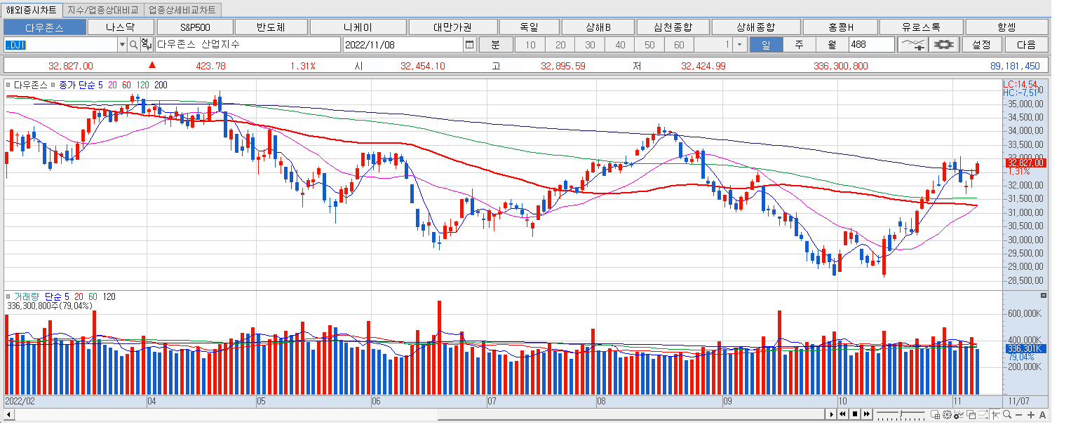 전일 미국증시는 2 거래일 연속 상승 미국 중간선거를 하루 앞두고 장막판 투자심리가 살아났고 중국 제로 코로나 정책 출구전략 관측 소식도 전해짐. 다우는 +1.31%, 나스닥 0.85%, S&P500 +0.96%