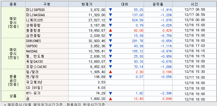| 12.16 마감시황 미국경제지표 부진에 따른 침체우려로 하락마감 (0) | 2022.12.16 |