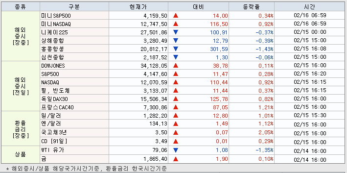 | 2월 15일 오늘 시황 뉴욕증시 예상치 상회한 물가지표에 혼조 마감 (0) | 2023.02.15 |