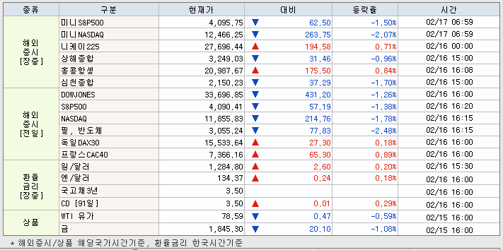| 2월 15일 오늘 시황 뉴욕증시 예상치 상회한 물가지표에 혼조 마감 (0) | 2023.02.15 |